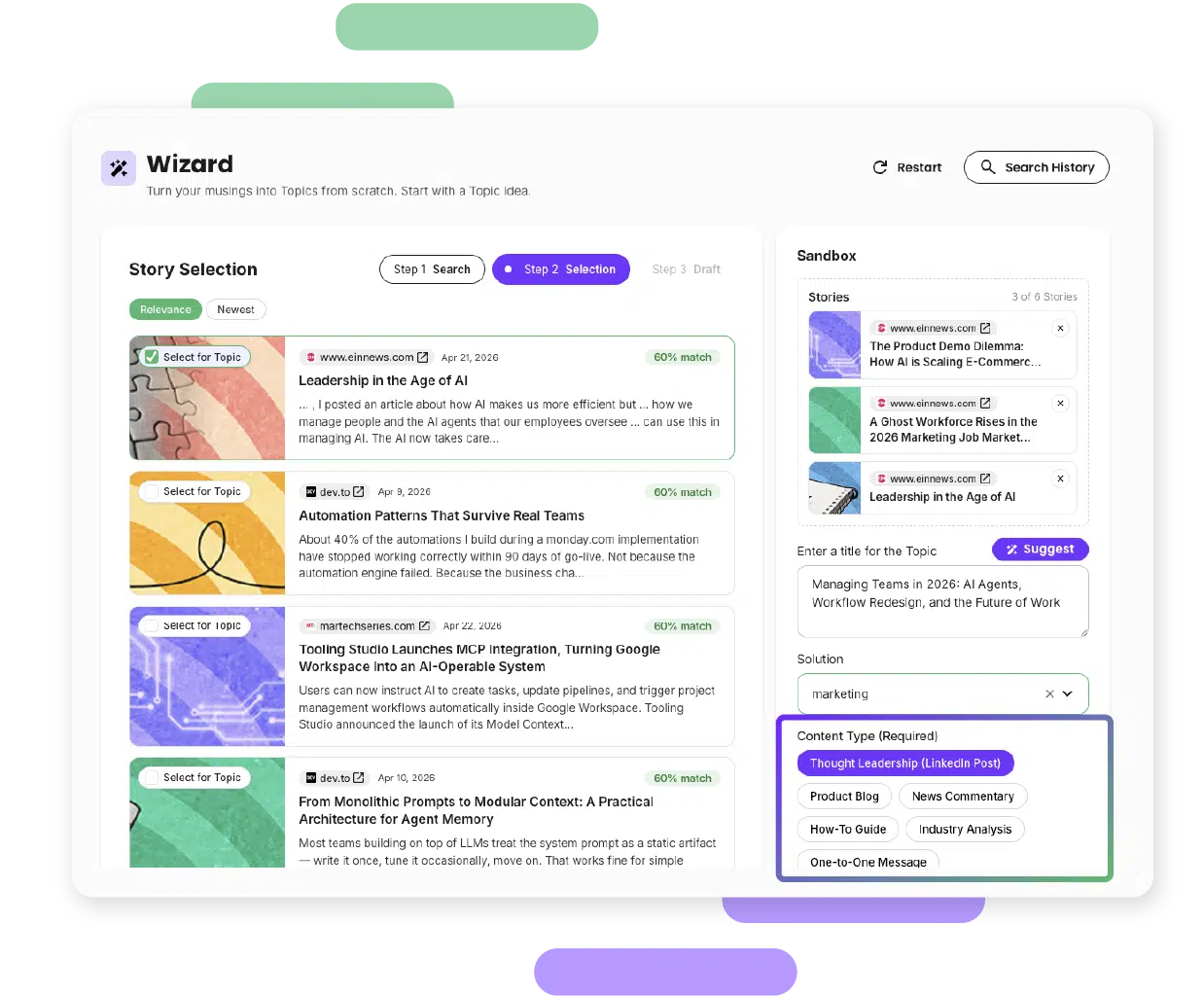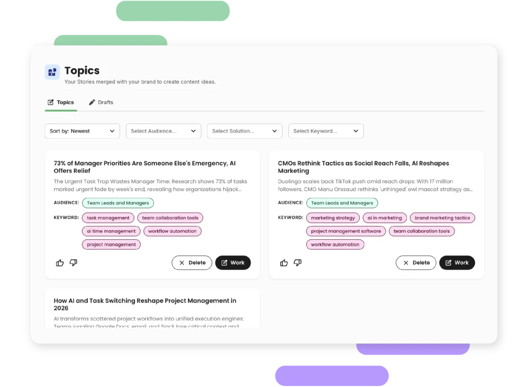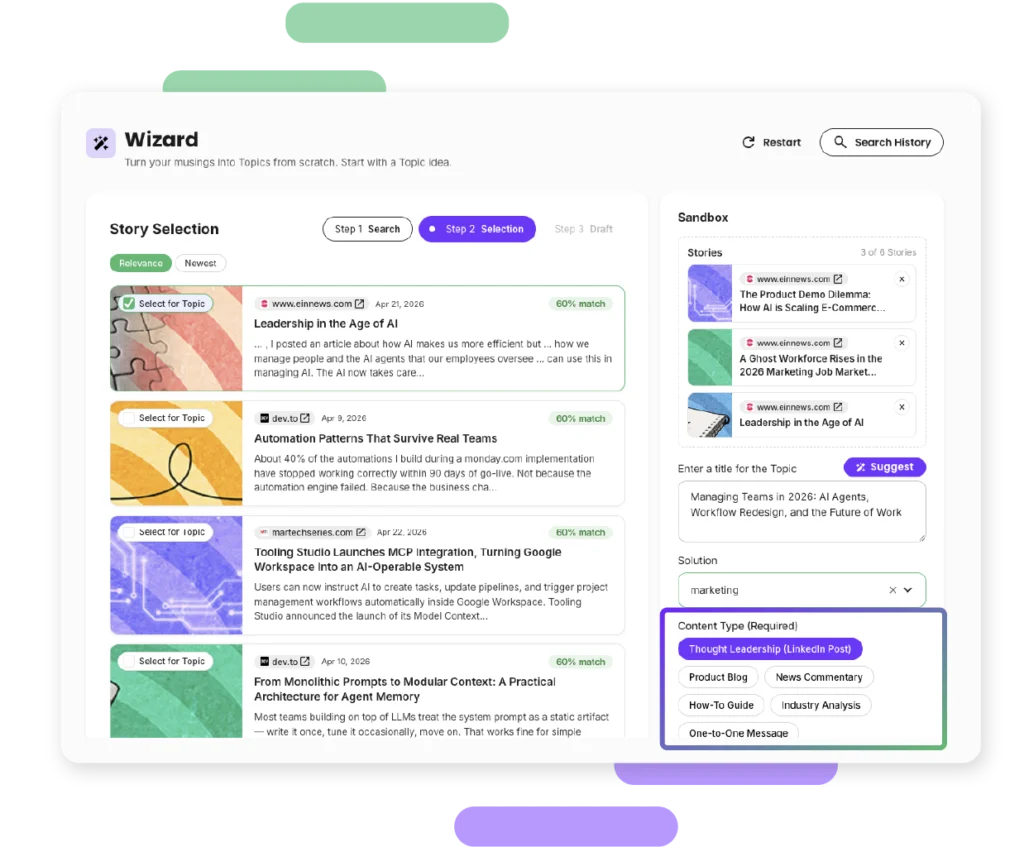 Stories land in your feed ready to become Topics. Use the Wizard to go deeper, or take the idea and run.