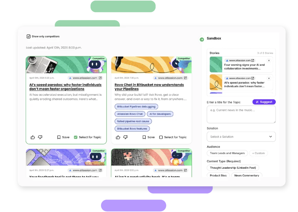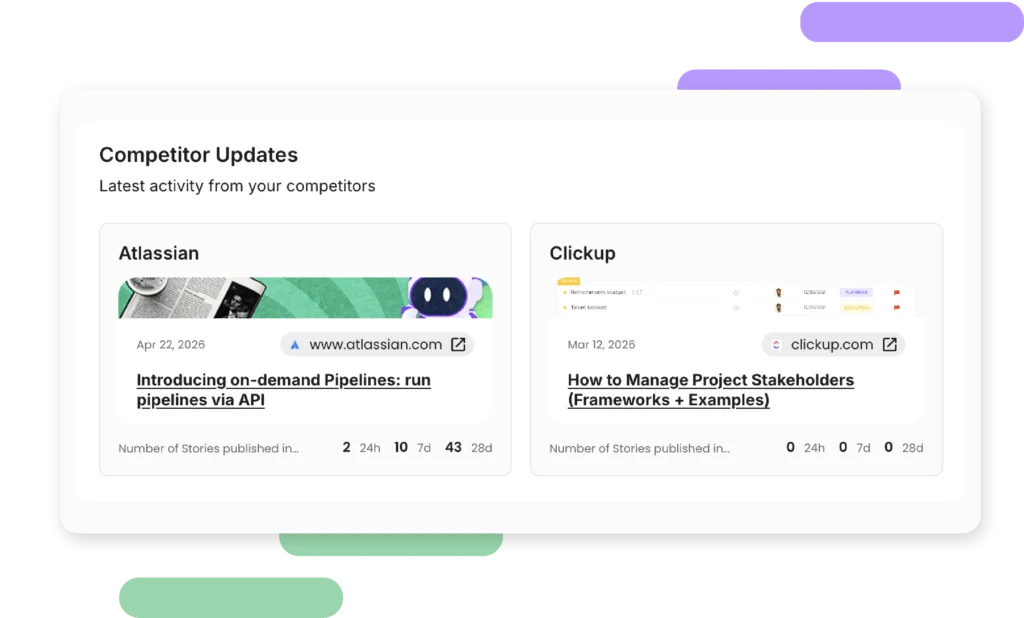 You might catch a major product announcement, but you’ll miss the quieter signals: publishing cadences, the topics they’re leaning into, the third-party coverage shaping how your shared audience perceives them.